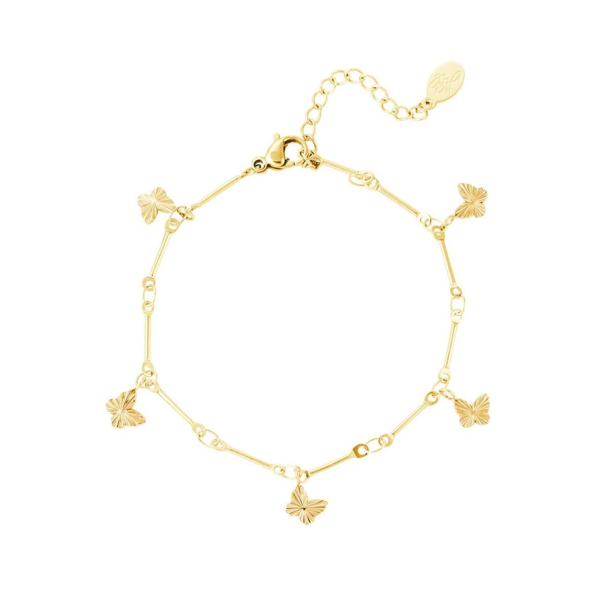 Gouden armband met vijf vlinder bedeltjes. Erg leuk om armband te combineren met meerdere gouden armbandjes om een leuke arm party te creëren!