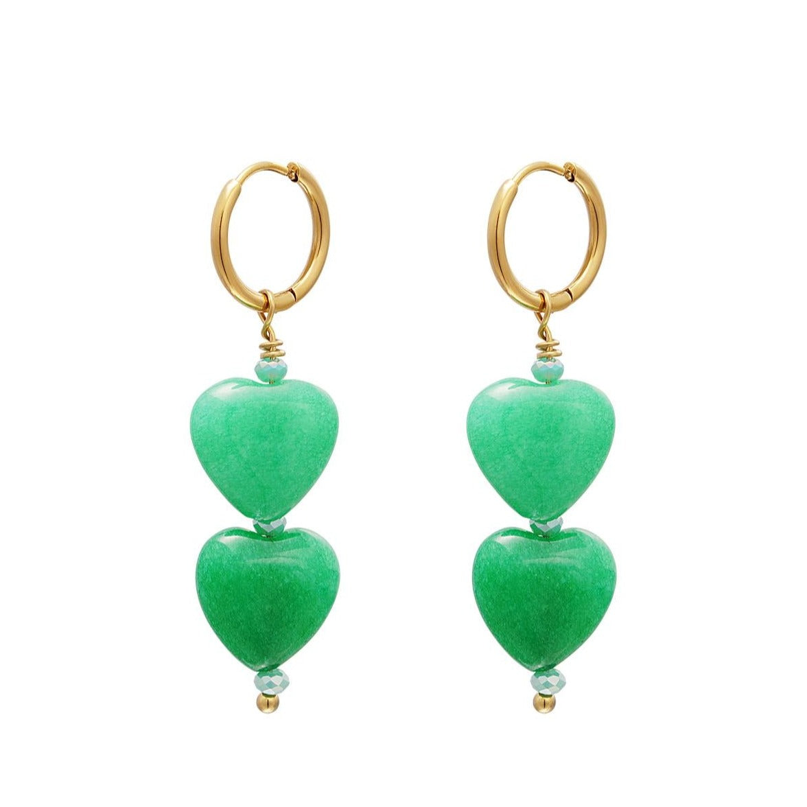 Hoe tof zijn deze gouden oorbellen met twee groene hartjes. Deze leuke oorbellen zijn gemaakt van stainless steel in combinatie met een stenen kraal in de vorm van hartjes.
