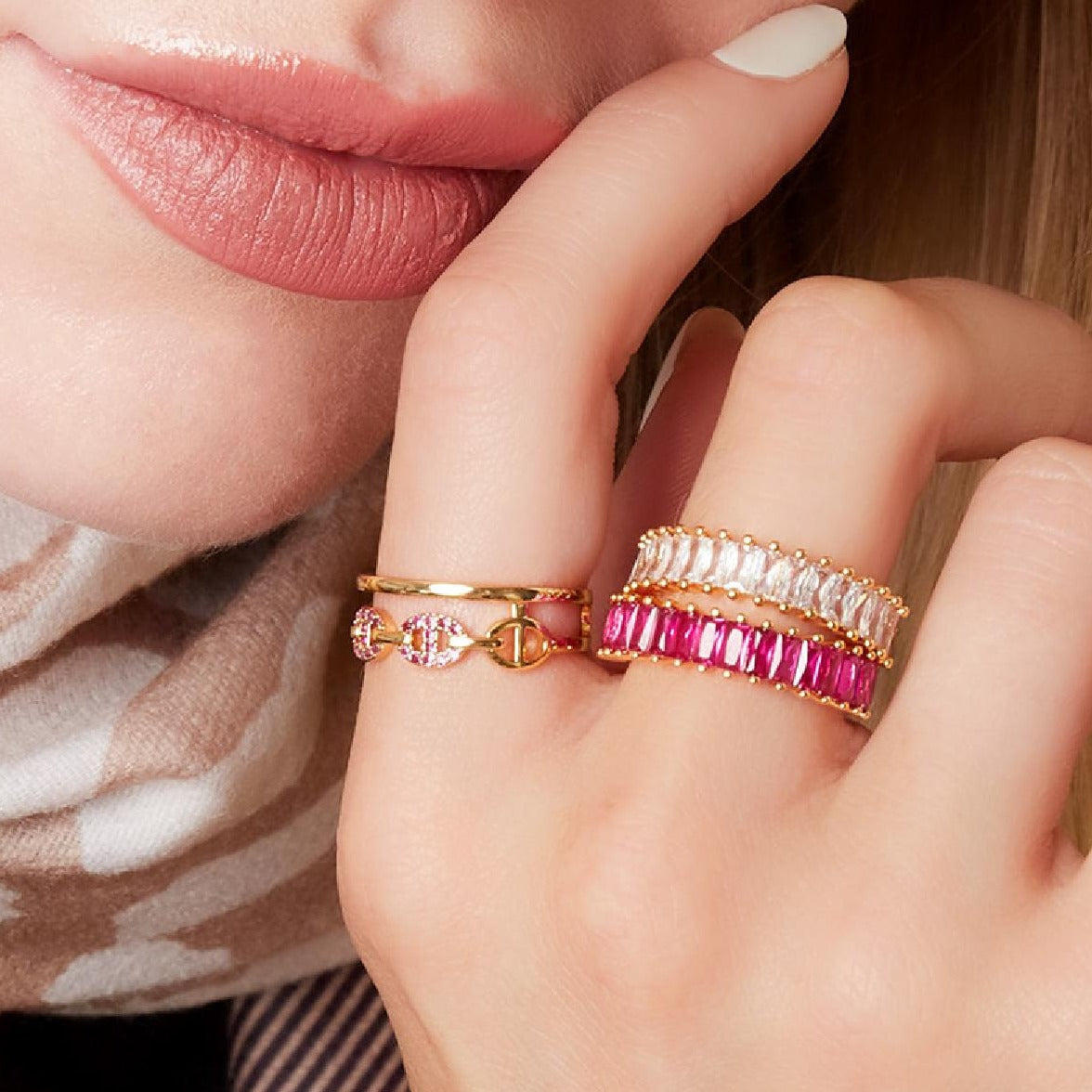 Deze dubbele ring met schakels heeft mooie zirkonium steentje waardoor je een feestelijke look krijgt. De ring is verstelbaar qua maat.
