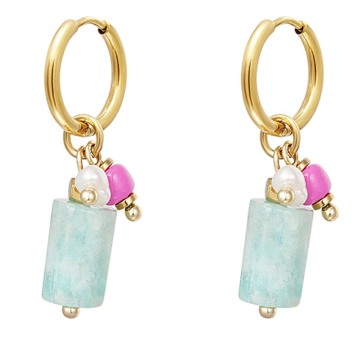 Toffe gouden oorbellen met een bedeltje en kleine kraaltjes. Het bedeltje is gemaakt van steen en de kraaltjes zijn gemaakt van glas kralen. Superleuk om deze oorbellen te dragen wanneer je voor een kleurrijke look gaat!