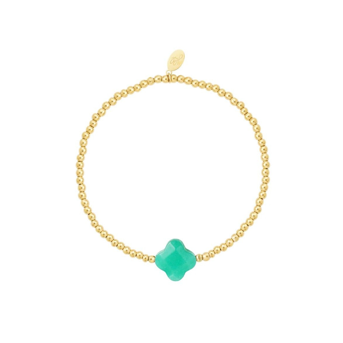 Deze prachtige gouden elastieken kralen armband met een klaver bedel is dankzij het leuke kleurtje perfect voor aankomend seizoen en kan leuk gecombineerd worden met meerdere klaver sieraden!