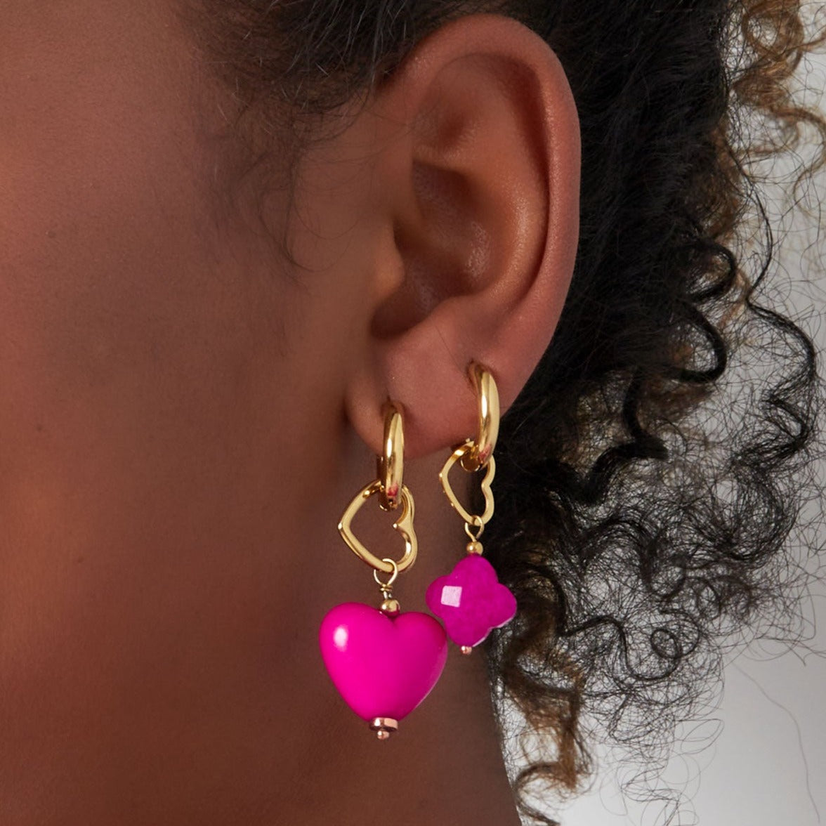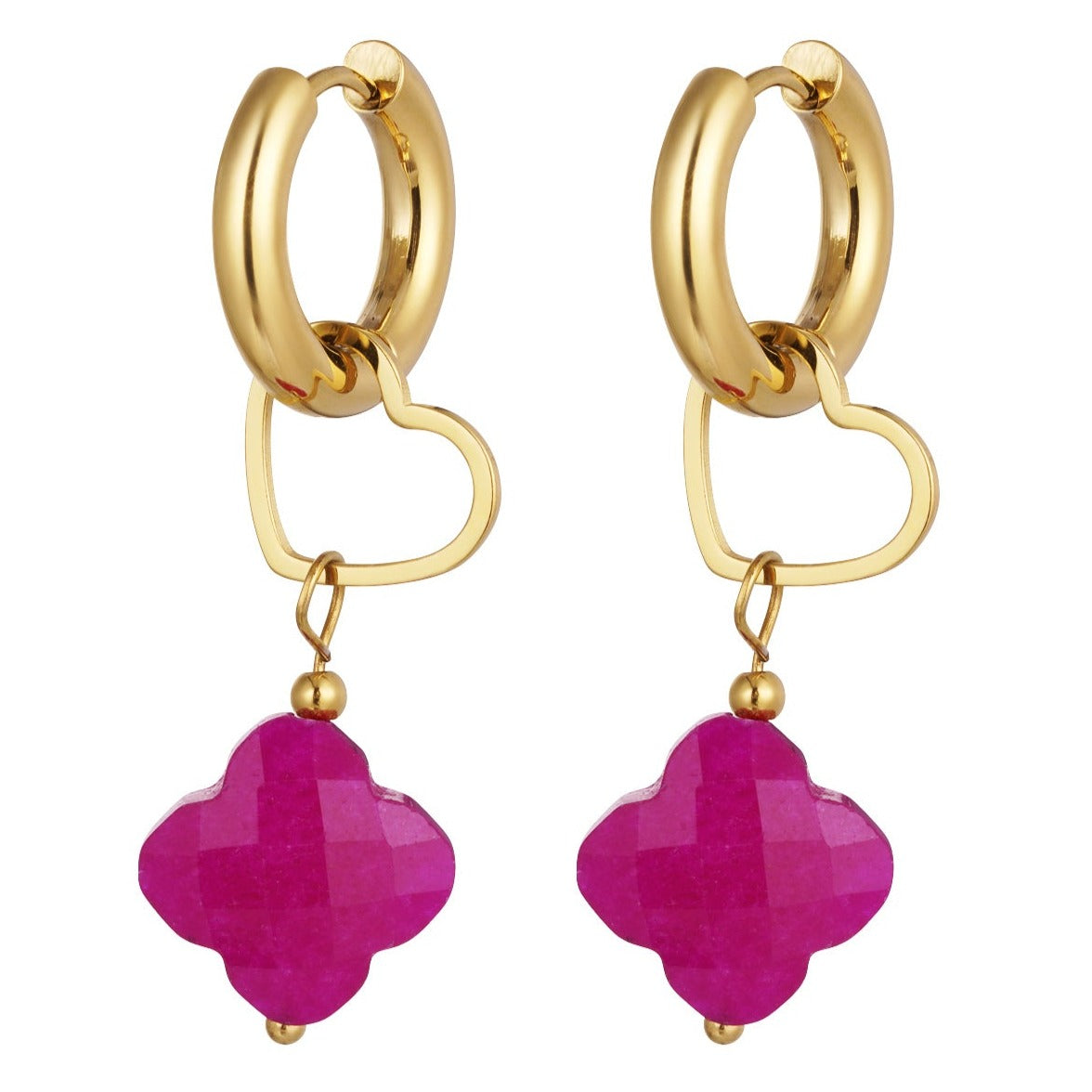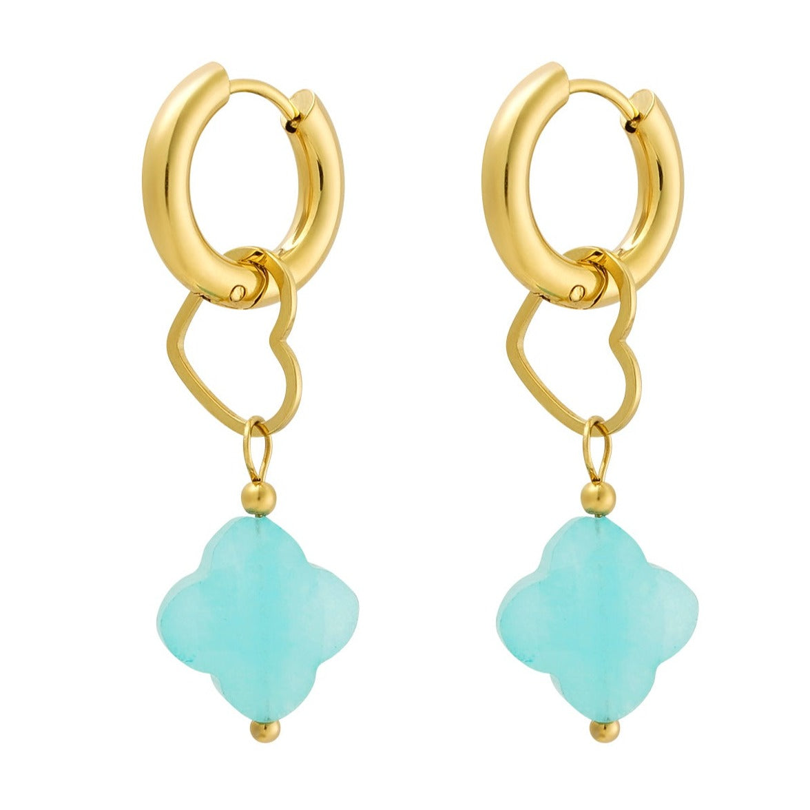Hoe leuk zijn deze prachtige gouden oorbellen met hart en gekleurde klaver bedel. Maakt van elke outfit een feestje.