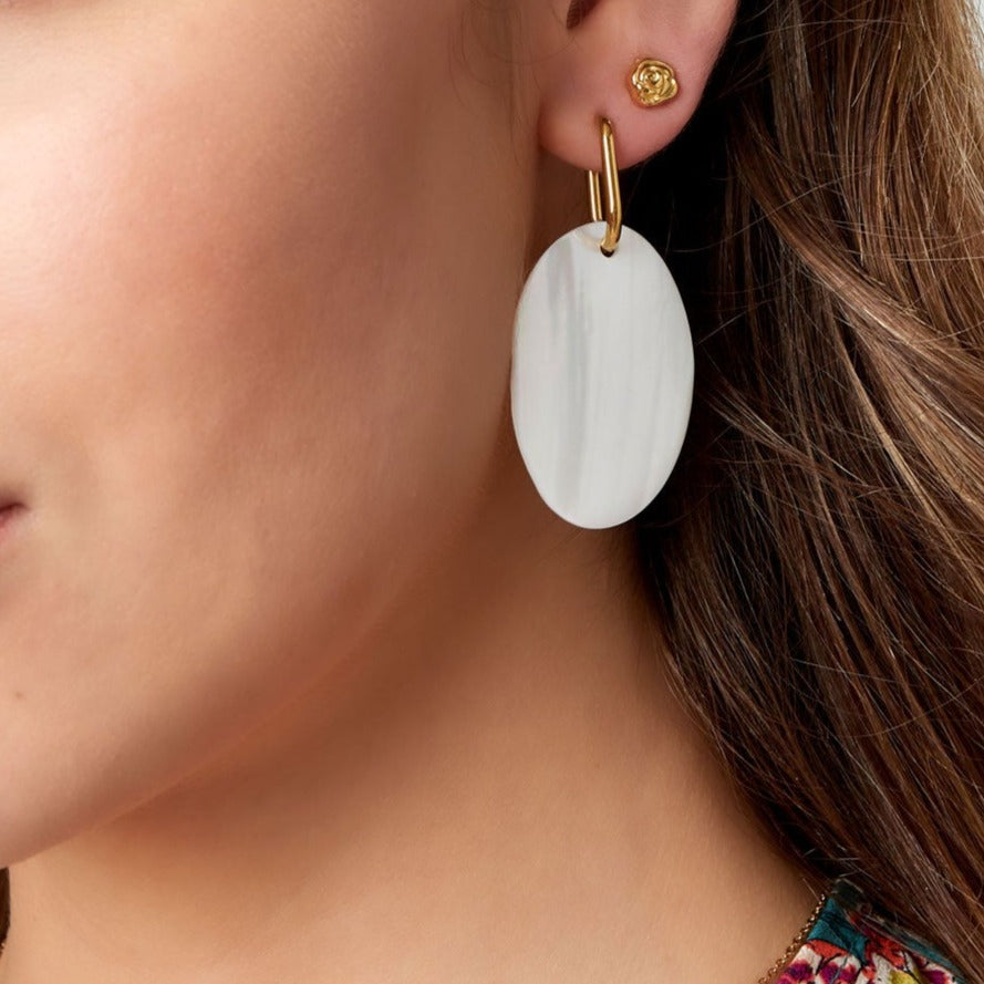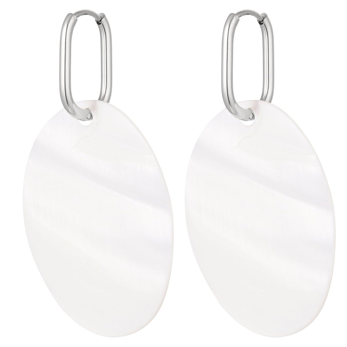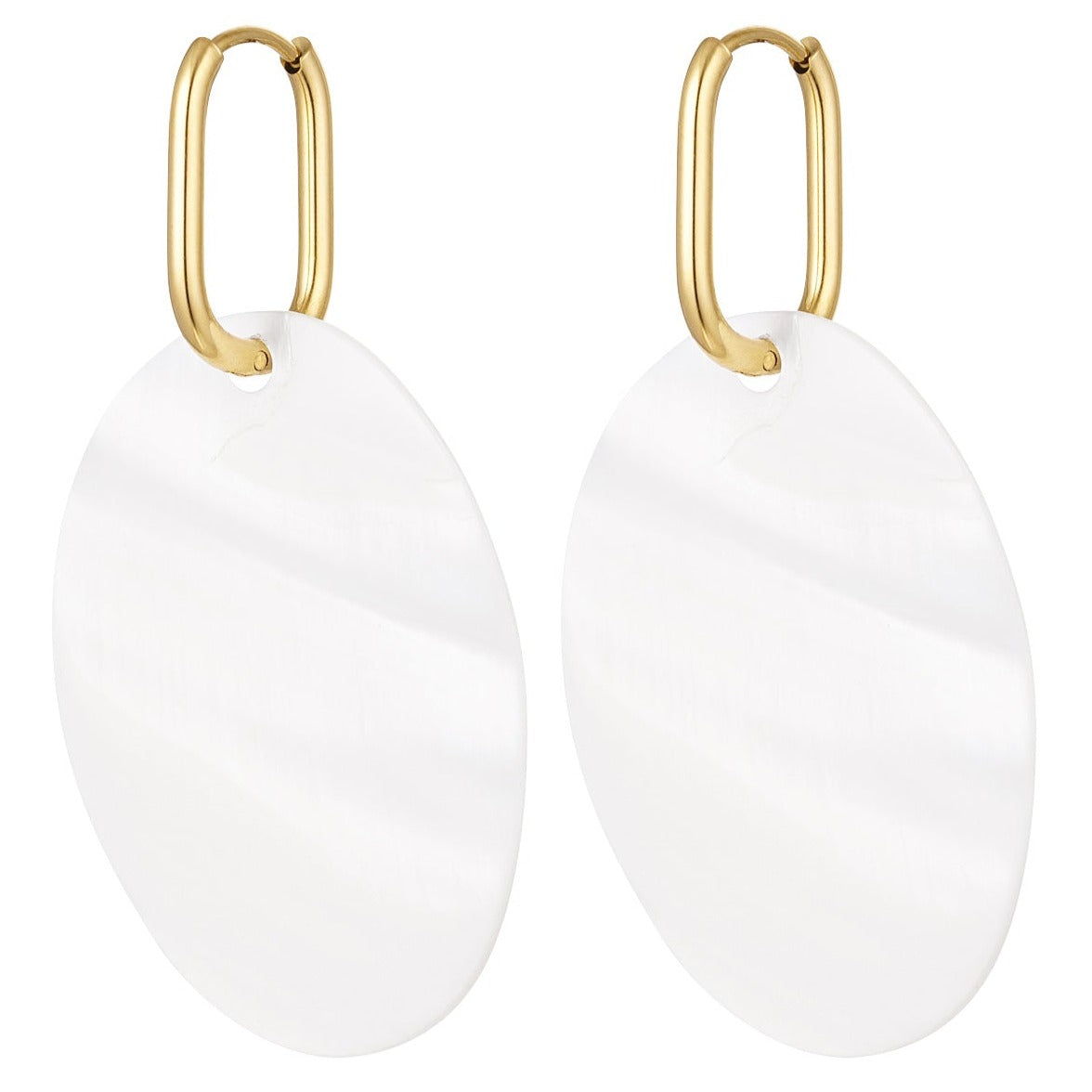 Oorbellen met grote witte coin. Deze oorbellen zijn zeer geschikt voor elke gelegenheid en kunnen met elke outfit gecombineerd worden, ideaal! De oorbellen zijn gemaakt van Stainless steel en zeeschelp en hebben een afmeting van 5,6 cm. De oorbellen zijn verkrijgbaar in de kleuren goud en zilver.
