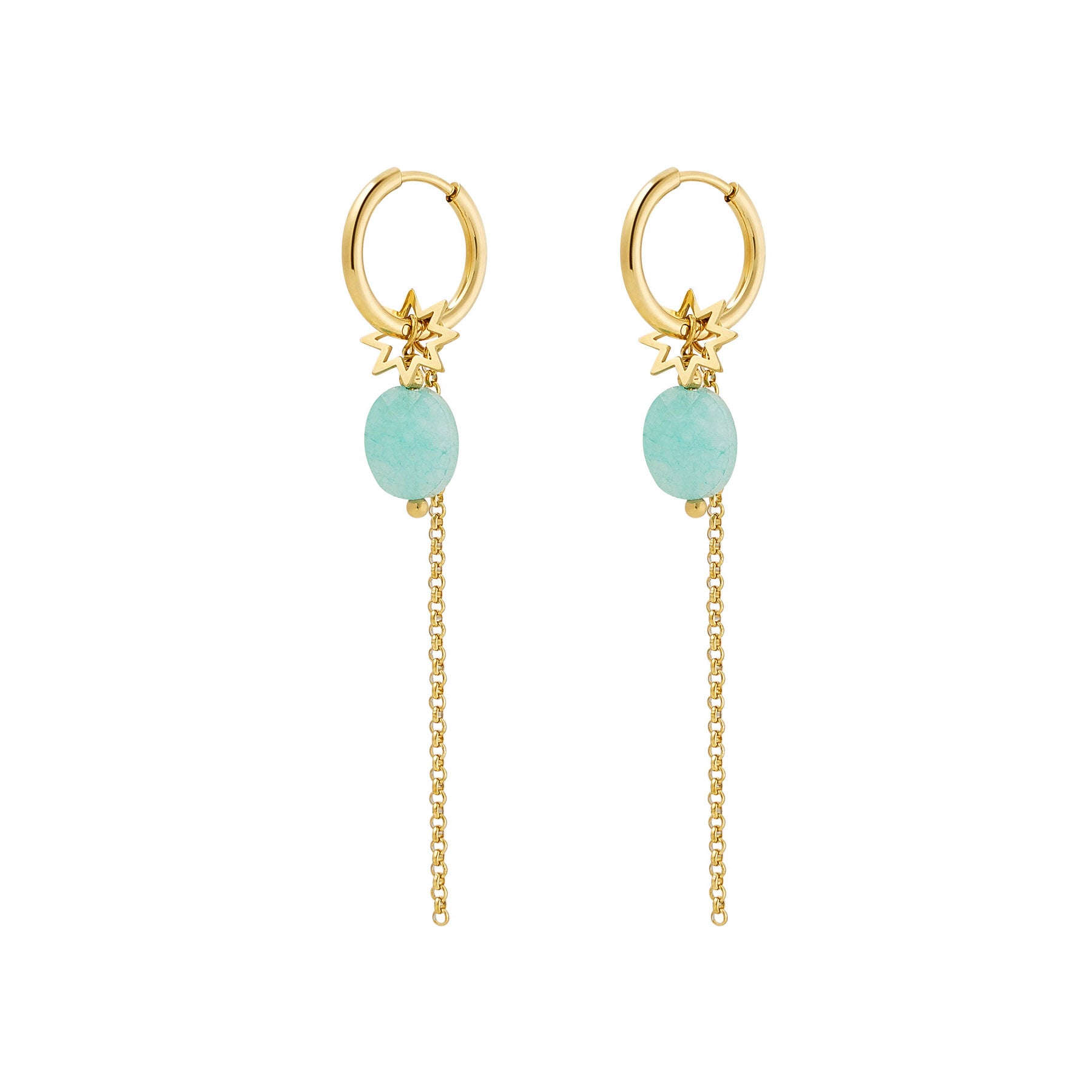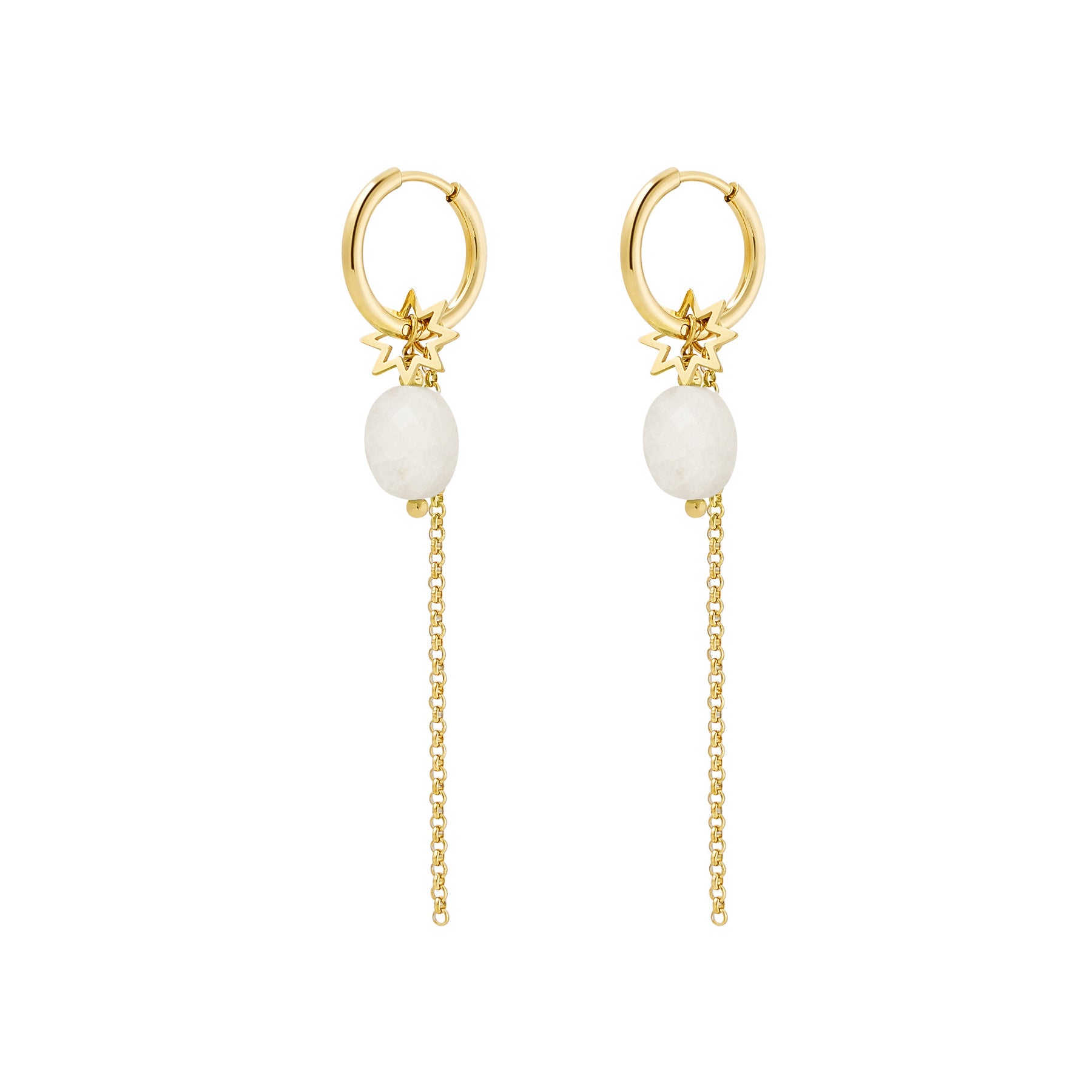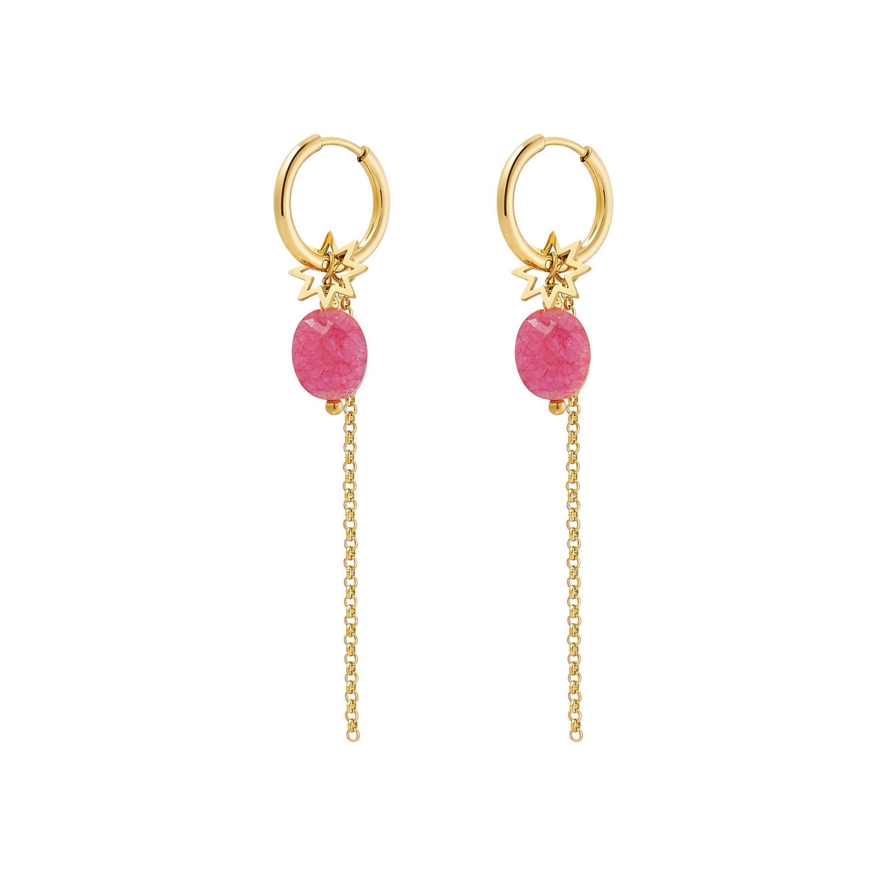 Deze gouden oorbellen met schattig kettinkje, sterretjes bedel en een steentje zijn zo tof! Superleuk te combineren met meerdere matchende oorbellen of andere sieraden.