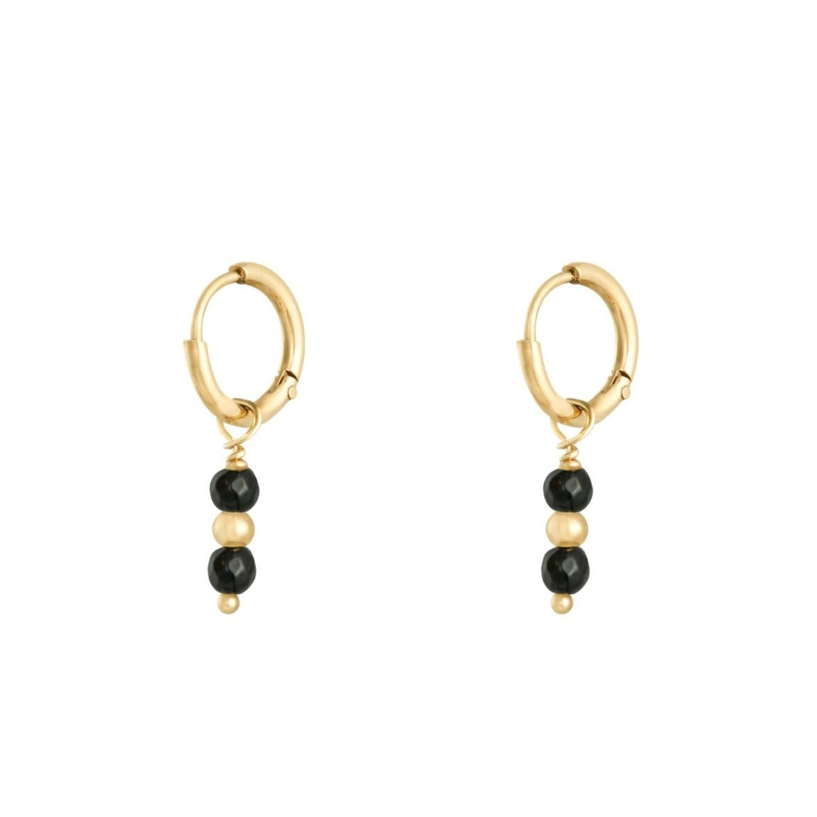 Leuke gouden oorbellen met zwarte natuursteentjes. Deze oorbellen kan je goed combineren met andere kleine oorbelletjes.