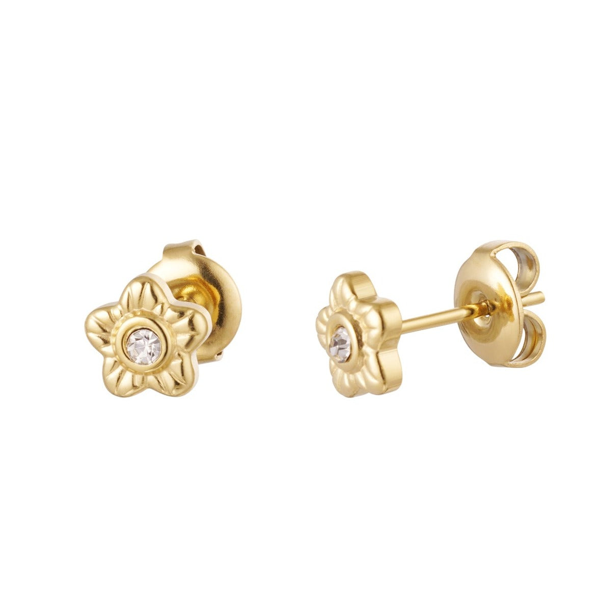 Hoe schattig zijn deze gouden oorstekers van Yehwang! De oorstekers kunnen letterlijk bij elke ear party gedragen worden en zijn voorzien van een klein wit steentje in het midden. Erg leuk om deze oorbellen bijvoorbeeld met meerdere bloemen sieraden te dragen.