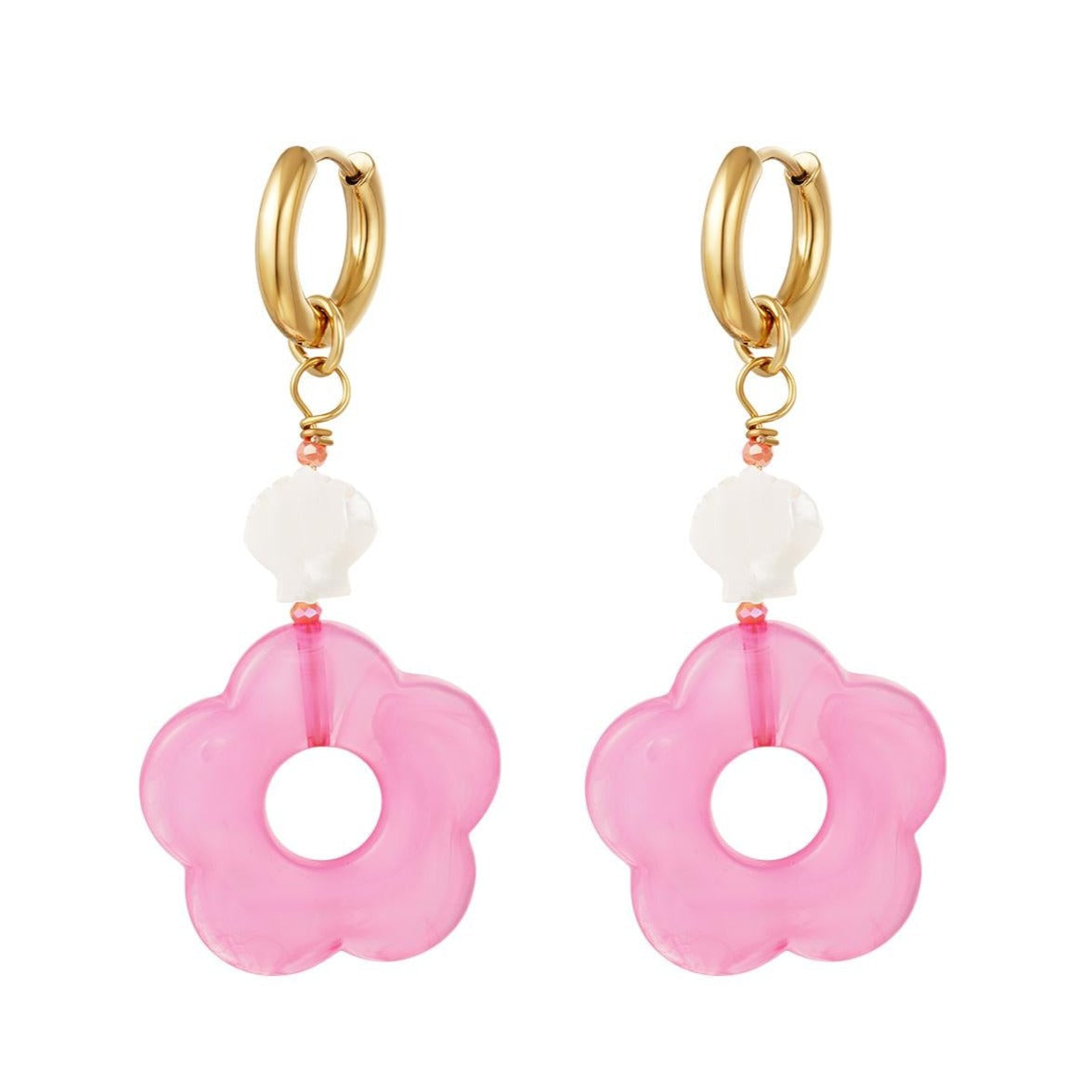 Zomerse oorbellen met kleine schelp en grote roze bloem. De oorbellen zijn niet zwaar.